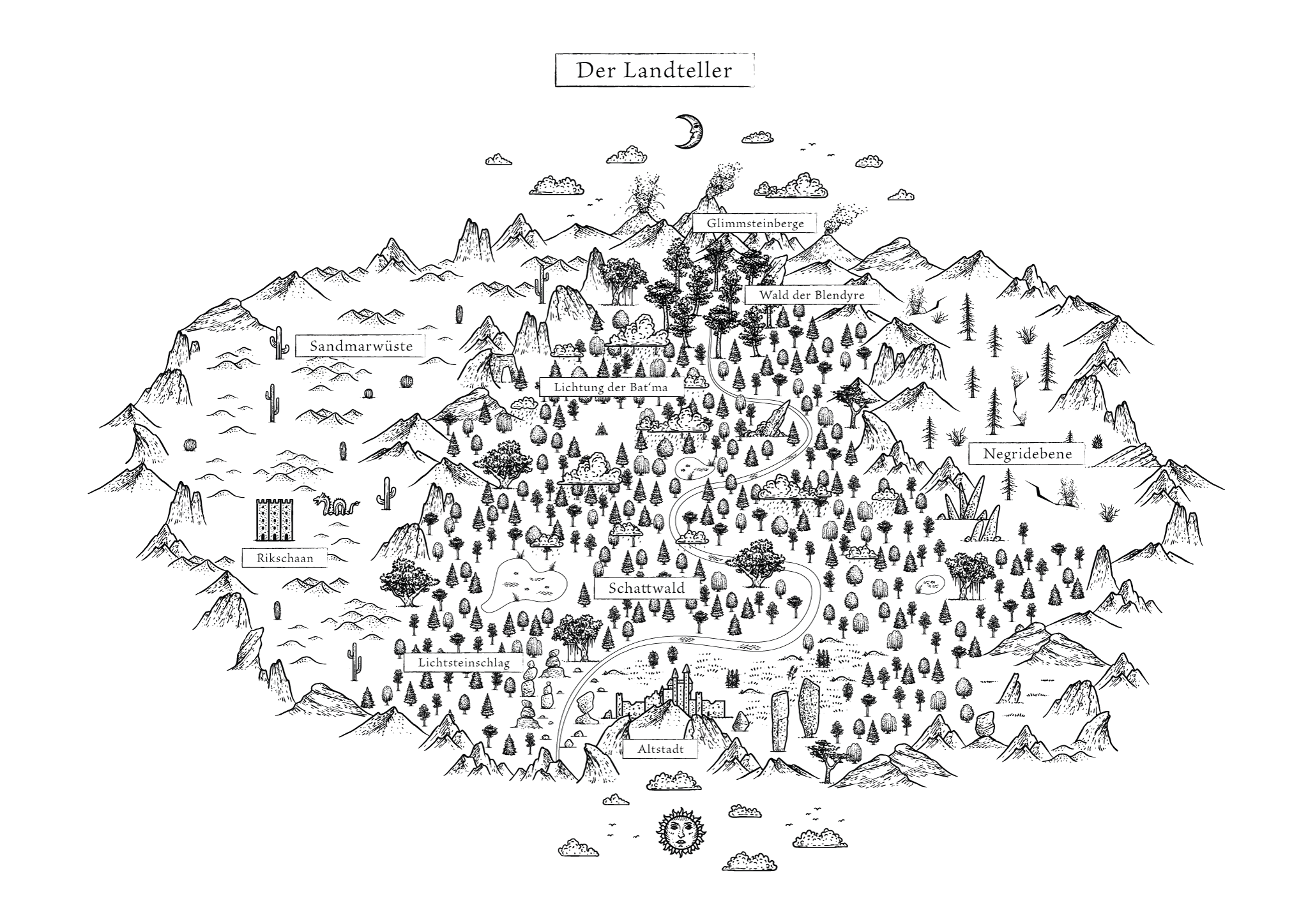 ._. Baumlose Flächen im Schattwald lassen sich an zwei Händen abzählen. Erzählungen der Hollanduinen zufolge ist die Lichtung der Bat’ma eine der größeren, wenn nicht die größte. Auf ihr lebt das Waldvolk seit jeher unter den Lichtsteinen, die am Halteballon über der Lichtung hängen. Zwischen ihrem Dorf und der Baumgrenze liegen die Wiesen und Felder, auf denen die ätherischen Pflanzen der Bat’ma prächtig gedeihen. Dahinter markieren die Glimmsteintafeln, welche die ganze Volksgeschichte zeigen, die Grenze zum düsteren Wald.